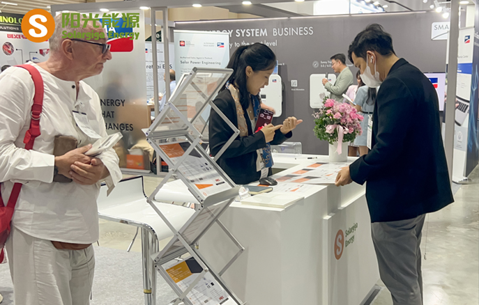 本屆展會,陽光能源帶來了1款N型組件和3款P型組件產(chǎn)品,現(xiàn)場工作人員向來訪客戶及觀眾詳細介紹了我司組件產(chǎn)品在不同場景下的實際應(yīng)用,涵蓋大型地面電站、工商業(yè)和住宅屋頂?shù)阮I(lǐng)域。值得一提的是,本屆展會展出的Giga-N系列組件基于182mm硅片,采用N型TOPCon電池技術(shù)并疊加雙面技術(shù),能夠為終端用戶帶來更高的收益率;此外,該款組件邊框采用聚氨酯材質(zhì),兼具優(yōu)異的力學(xué)性能和耐鹽霧、耐化學(xué)腐蝕性能,能夠應(yīng)對像泰國這種高濕高溫氣候的地區(qū),更堅固、更安全、更可靠。