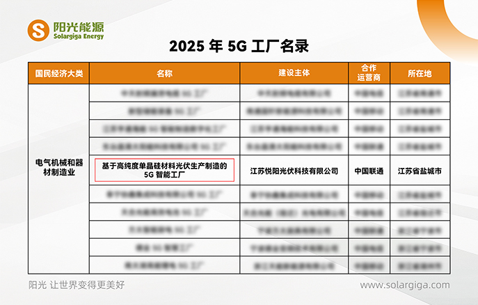 8 月 25 日,工業(yè)和信息化部公示了《2025年 5G 工廠名錄》,陽光能源控股有限公司(以下簡稱“陽光能源”)旗下江蘇悅陽光伏科技有限公司(以下簡稱“悅陽基地”)憑借其在光伏制造領(lǐng)域先進(jìn)的 5G 融合應(yīng)用成果,成功入選這一國家級名錄。